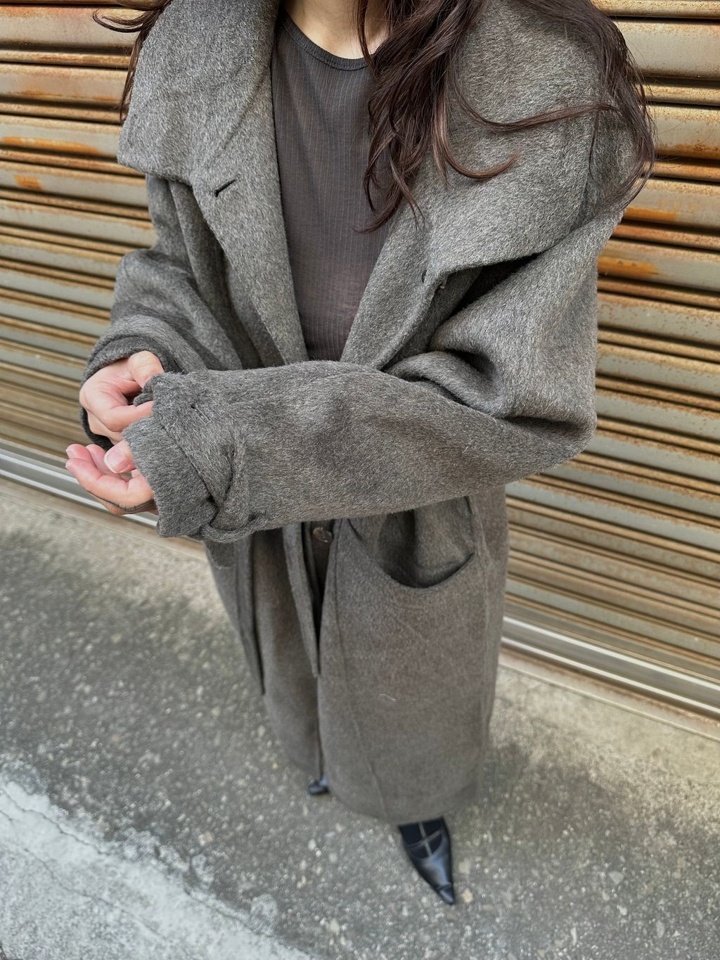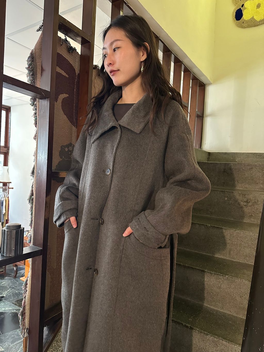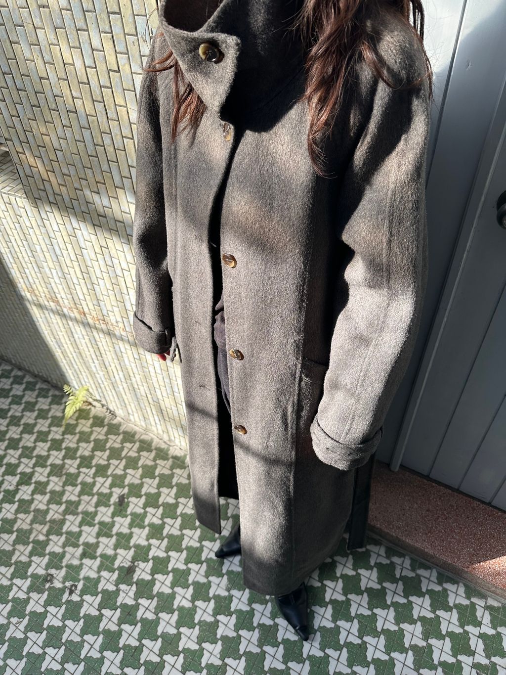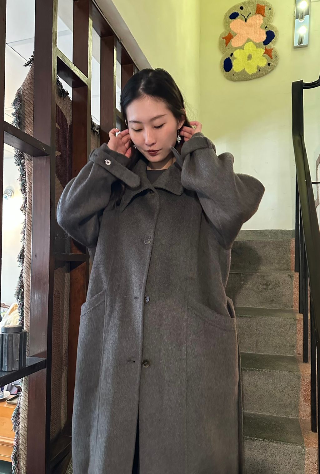這款的顏色是灰棕色,我自己是很愛灰色毛料大衣的人,因為是好搭、好看又很有質感的顏色
