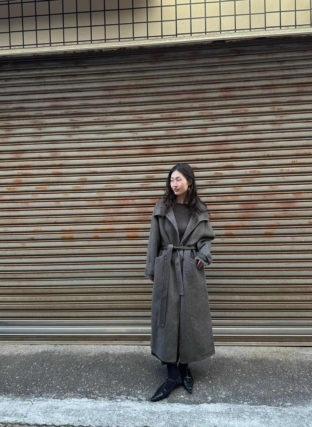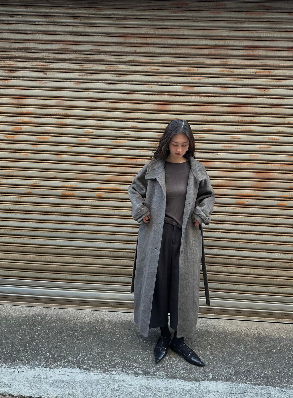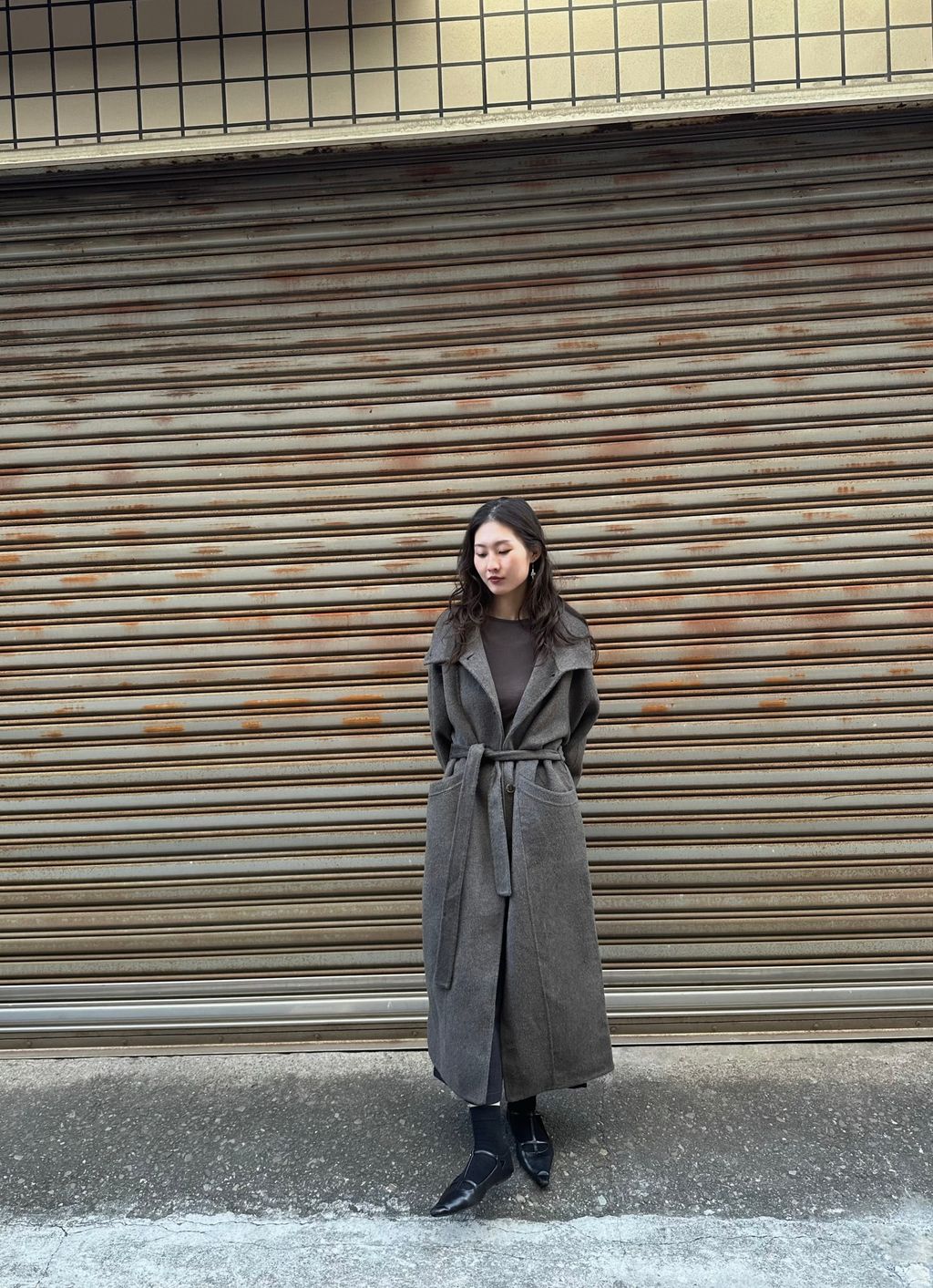 但這件帶棕色調,又不發黃,一樣有著灰色調的清冷感,但不會像一般灰色長大衣那麼嚴肅的感覺,反而比起正統的灰色調更加時髦又耐看