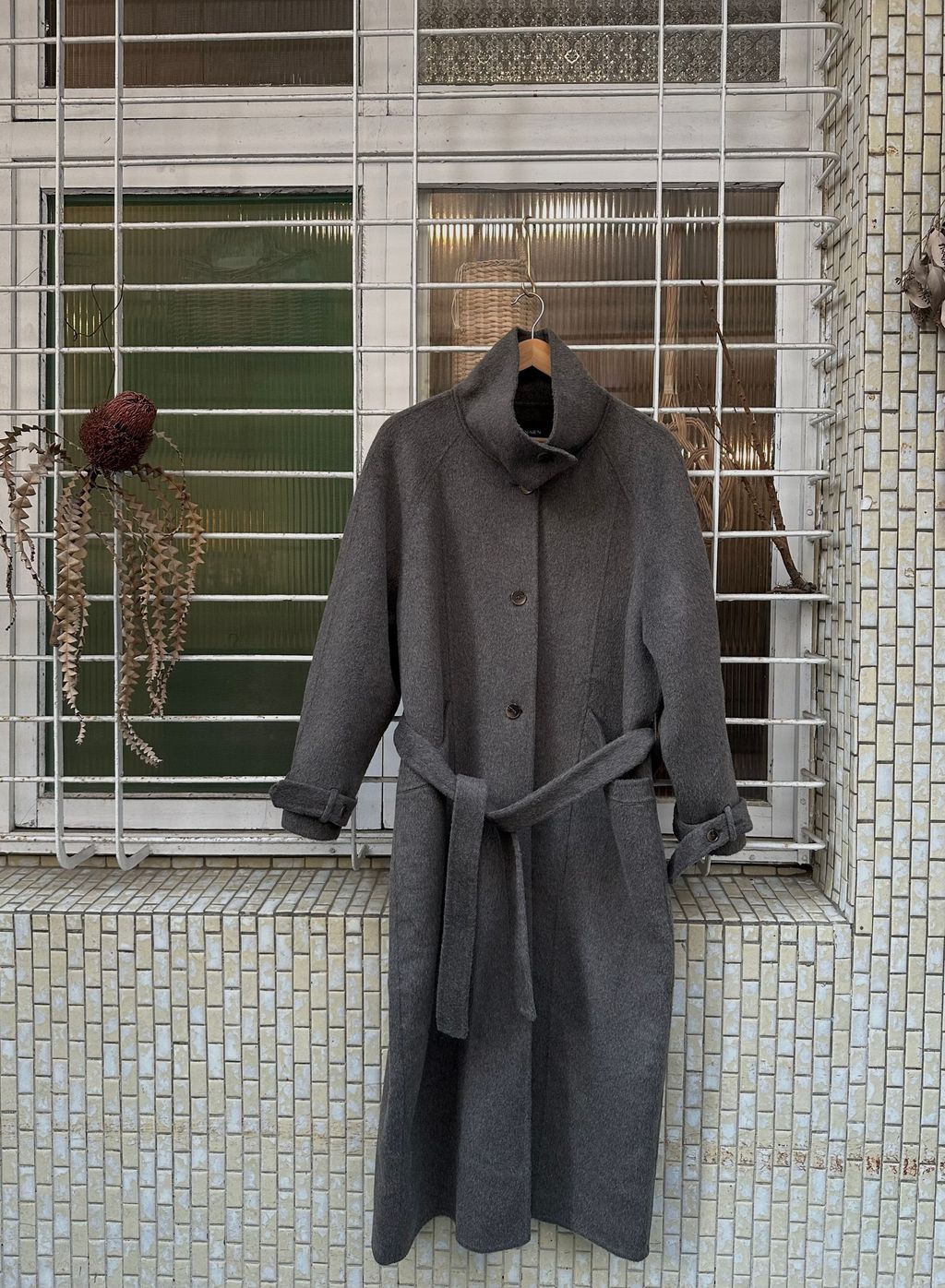 灰棕色天絲羊毛手工長大衣