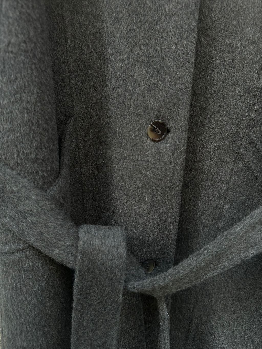 是柔軟的質感,不會像有的羊毛大衣布料壓得太緊,硬又厚重的感覺,這件的布料是羊毛大衣難得是輕盈感的(但一整件用料很足夠,整件當然不是輕的哦哈哈,有一定的份量)