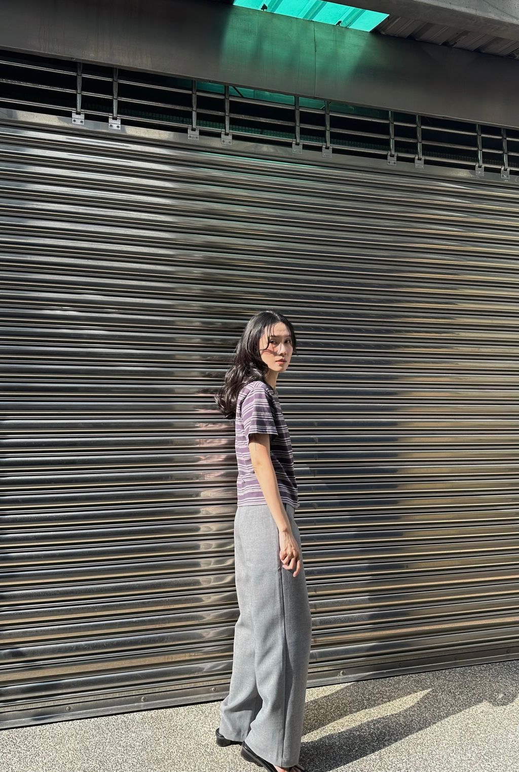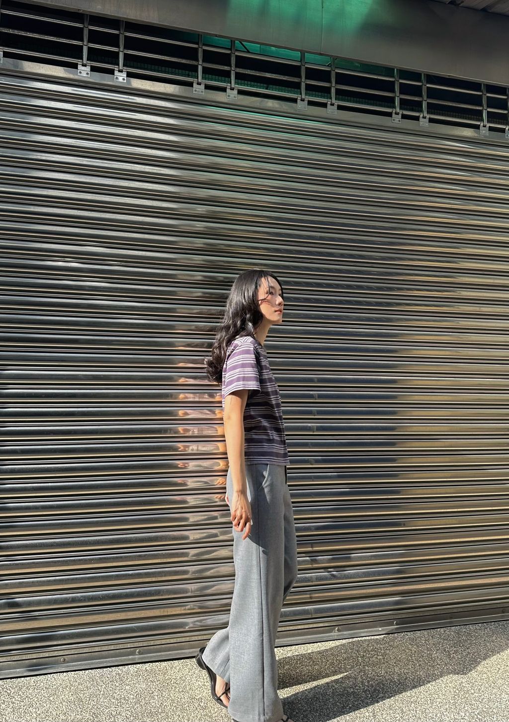 這個紫色太會調,除了衣領撞色灰色很搭之外,這個紫色搭配棉質呈現出來的色澤很自然,不是那種華麗感覺的紫色