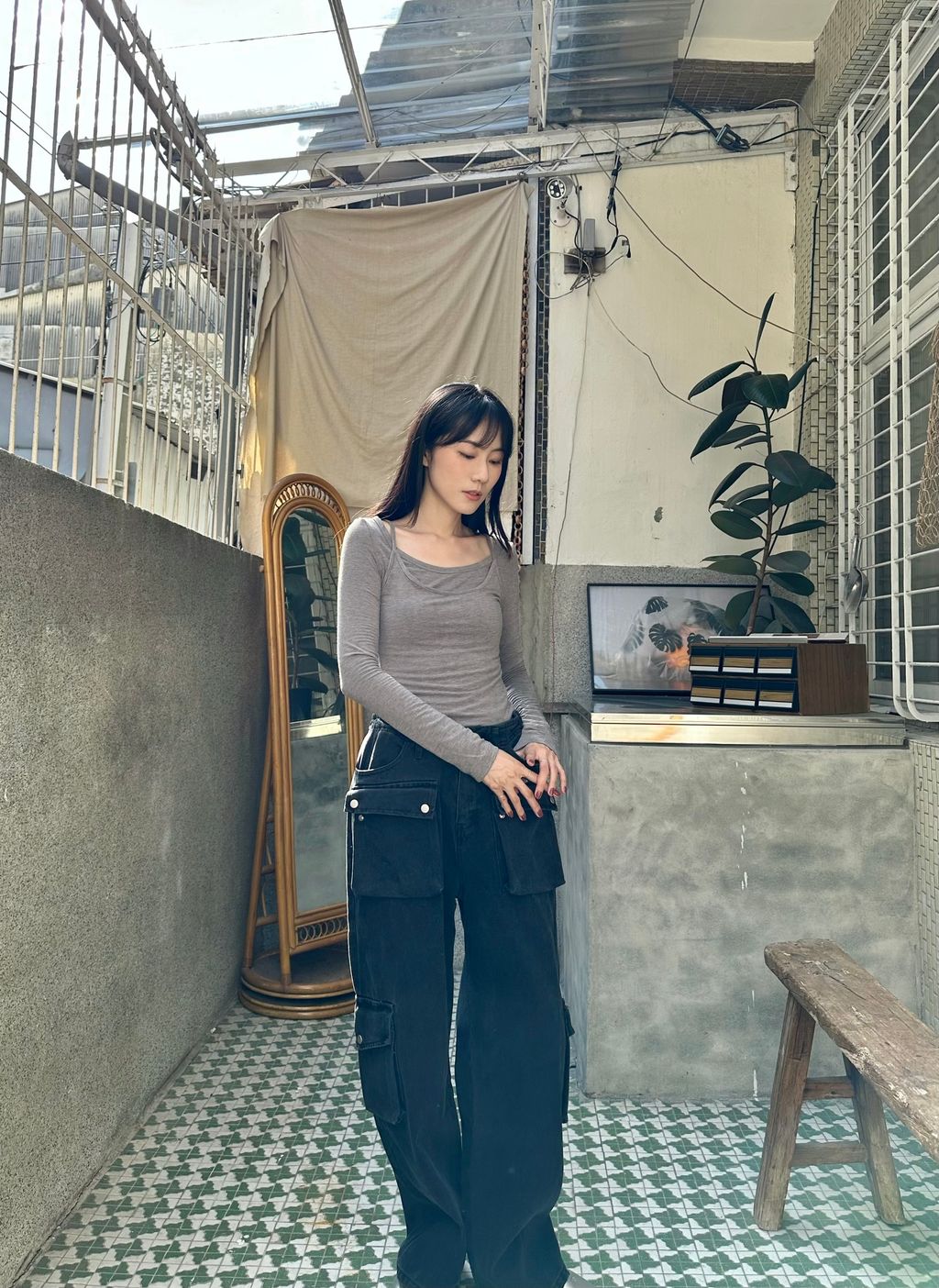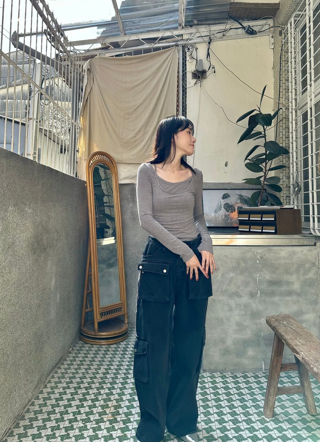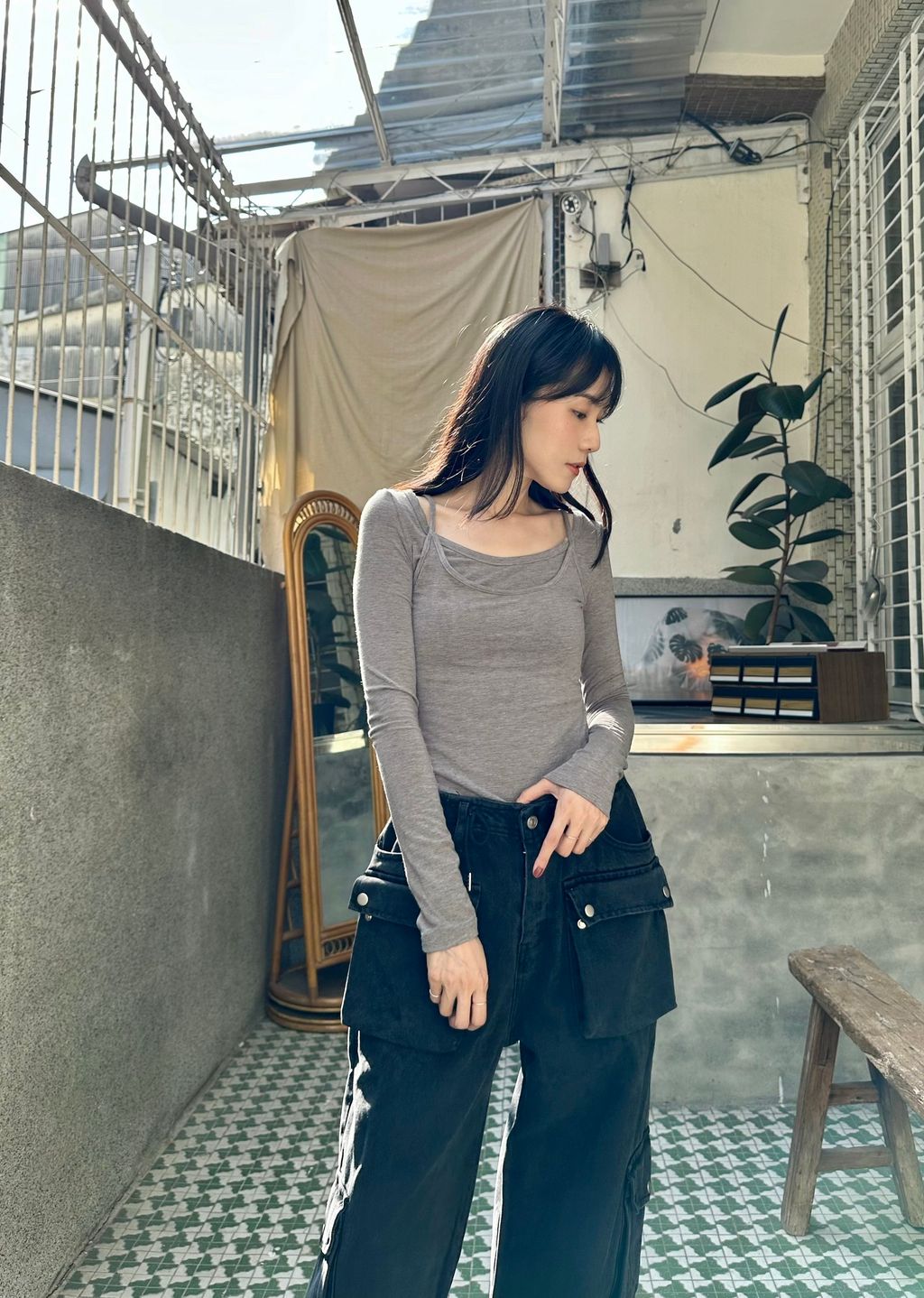 底下的是挖圓領設計,上層是細肩帶的樣式,兩種剪裁搭一起,可以俐落展現脖子與鎖骨的線條感