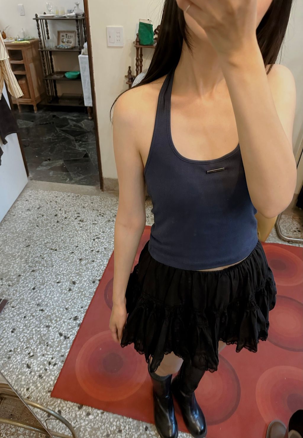 腰圍那節剪裁做的平整,所以即使上衣穿的比較短,也不會有層次裙腰圍膨起來顯胖的問題,然後下擺的裙擺又往外延展,所以很~顯瘦