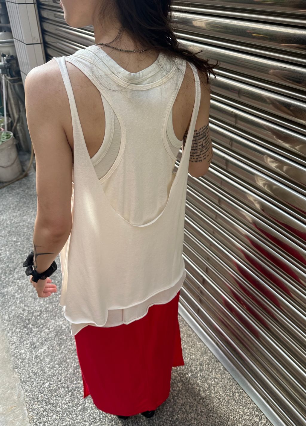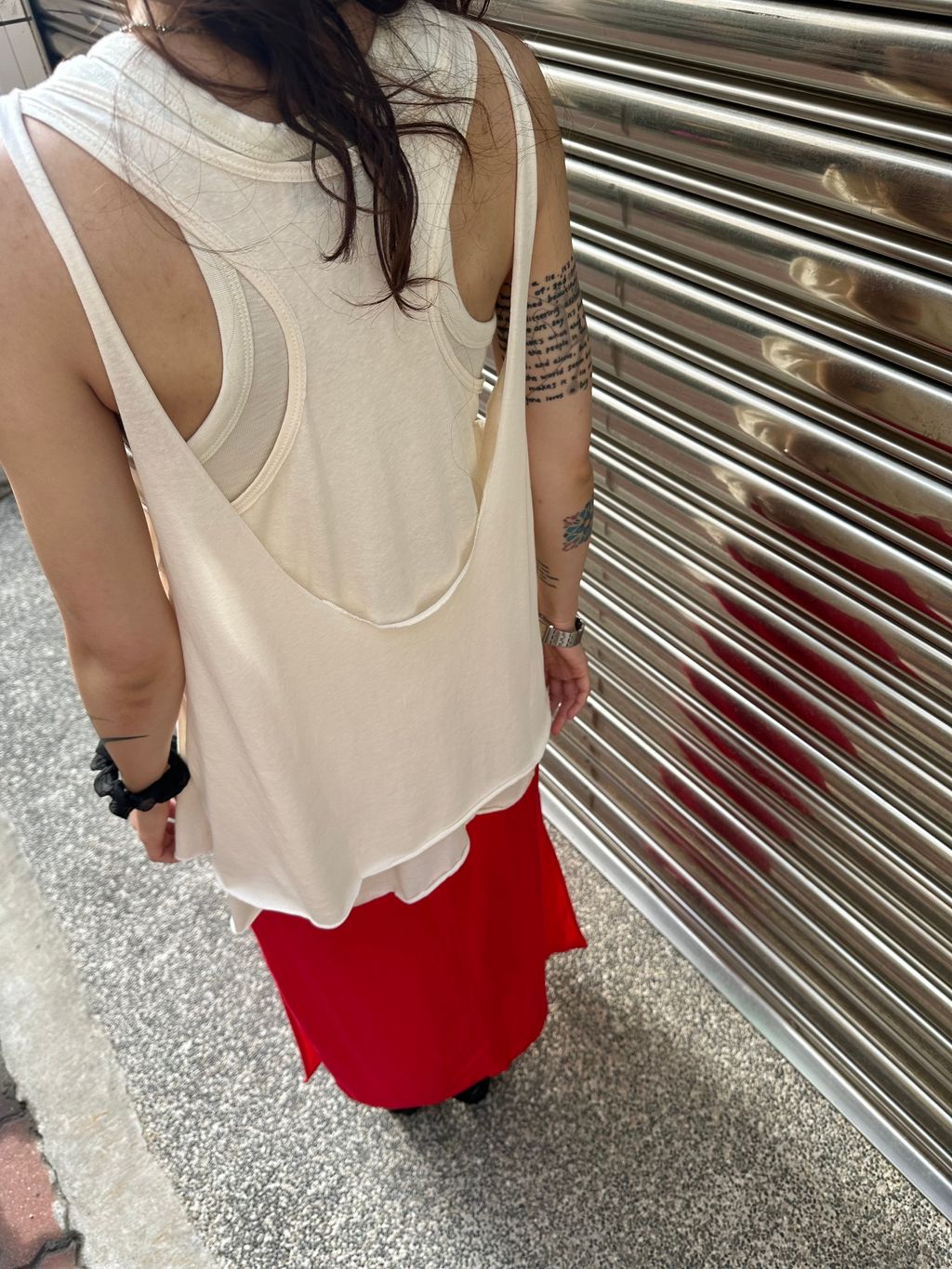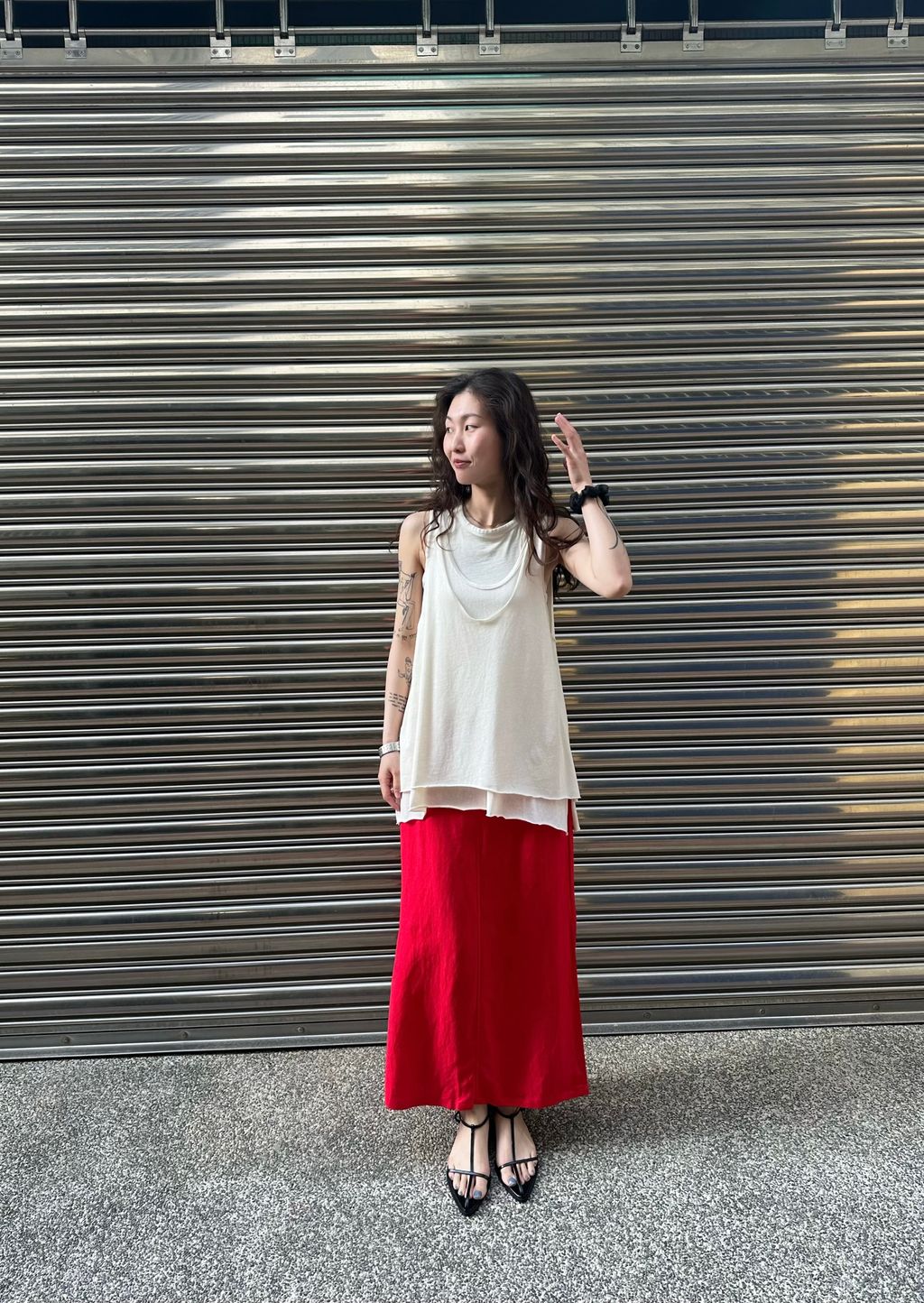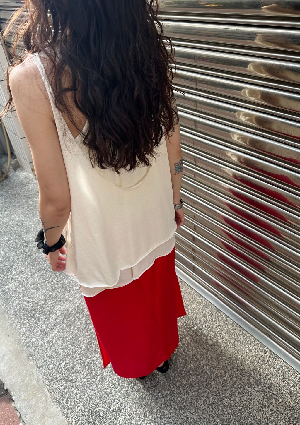 這件裙子的設計,我推薦可以搭配上半身比較長版與帶寬鬆度的款式,下半身會有更收斂修飾的效果,整體更顯瘦