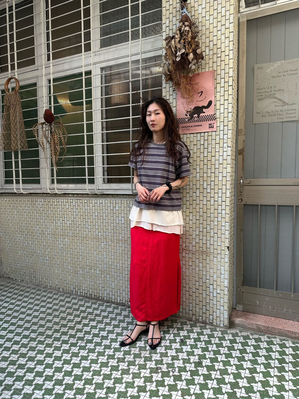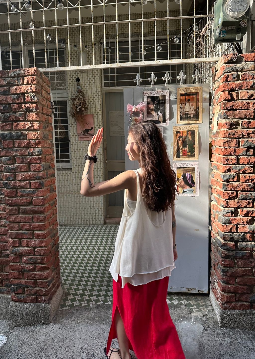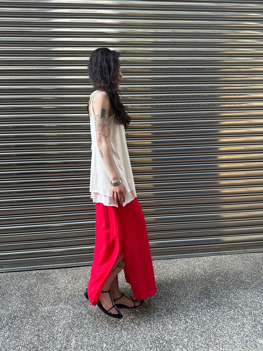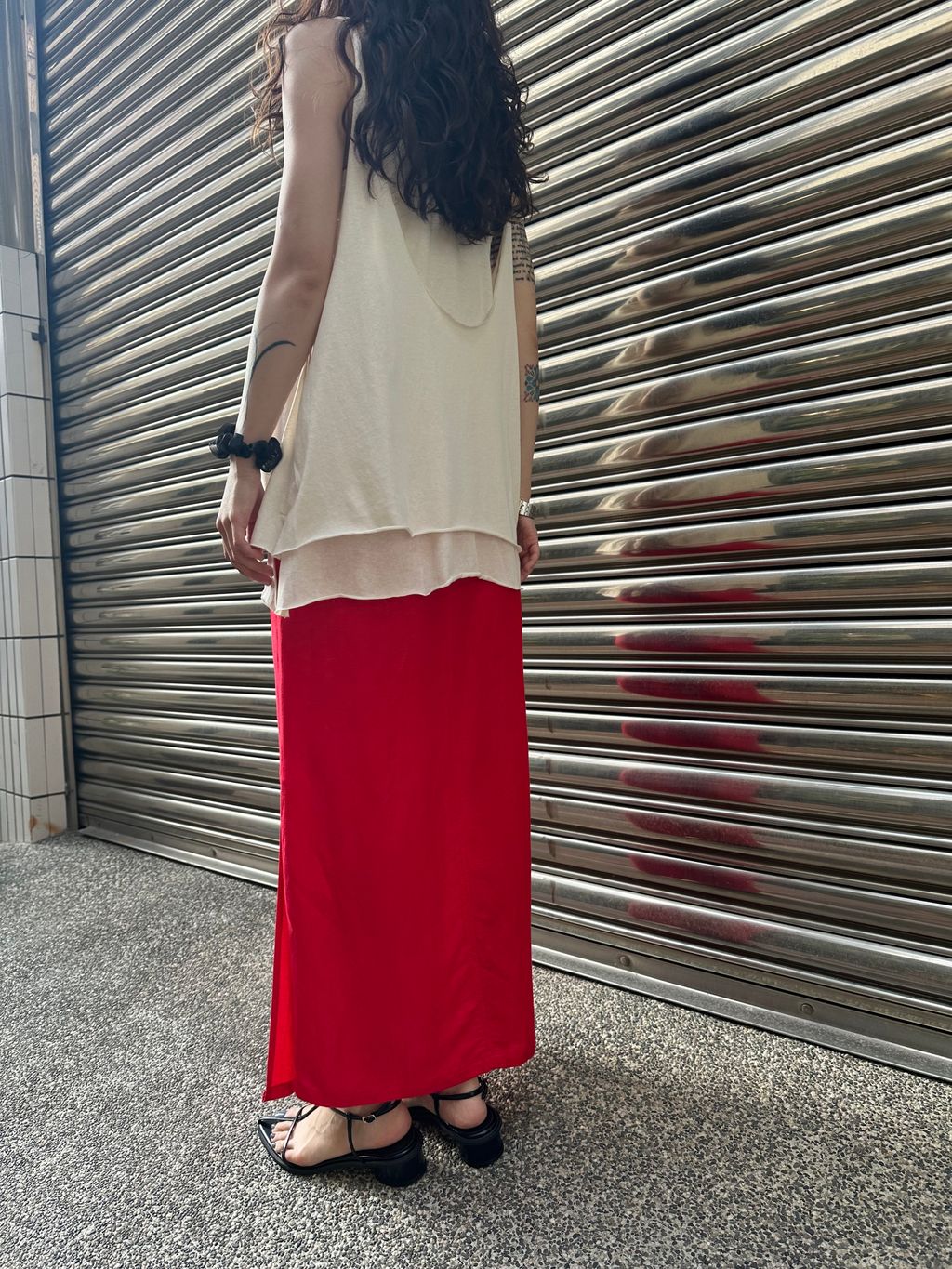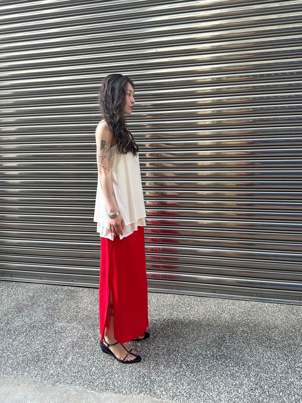 尤其側邊的高開衩,呼應了紅色個性之外,讓長裙穿起來有延伸的效果,有律動感,和方便活動