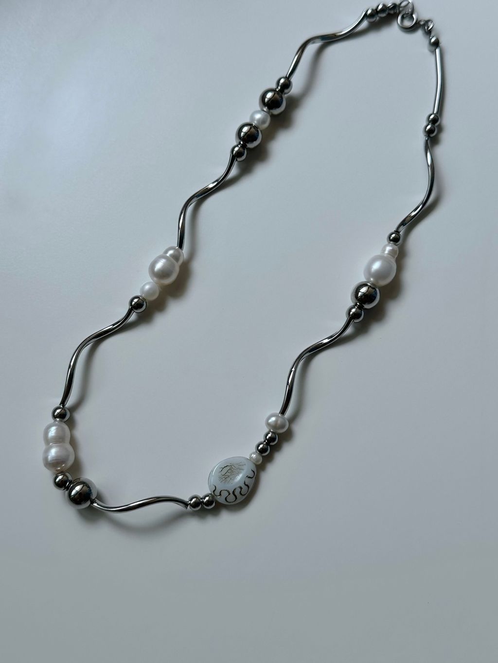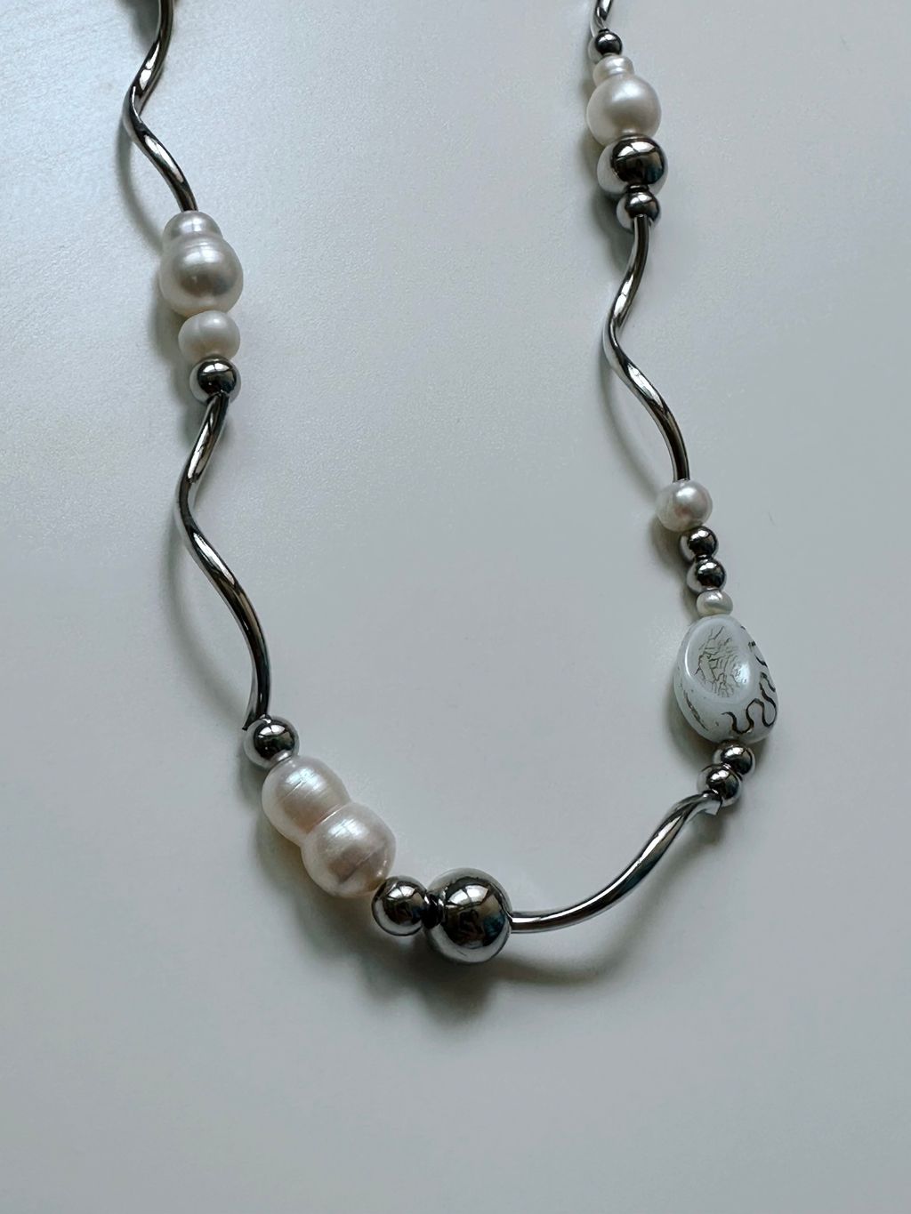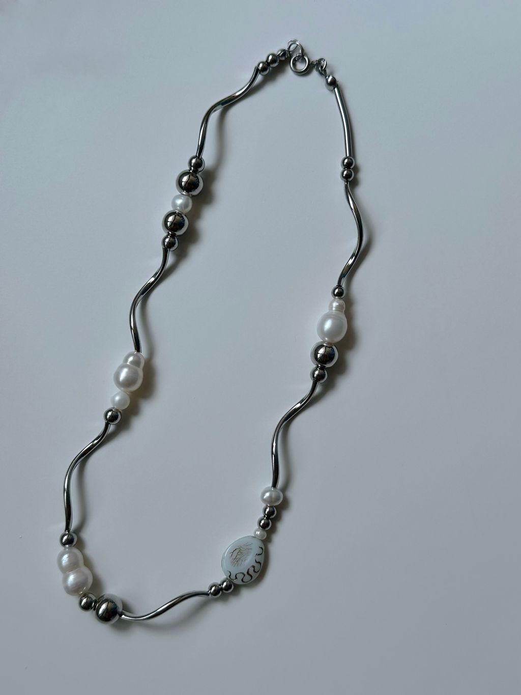 項鍊金屬部分也為鋼材製作,好照顧不變色,還有搭配天然淡水珍珠,有基礎的圓形和飽滿立體的特殊變形珍珠很個性,再點綴手工刻畫的蛋白琉璃石