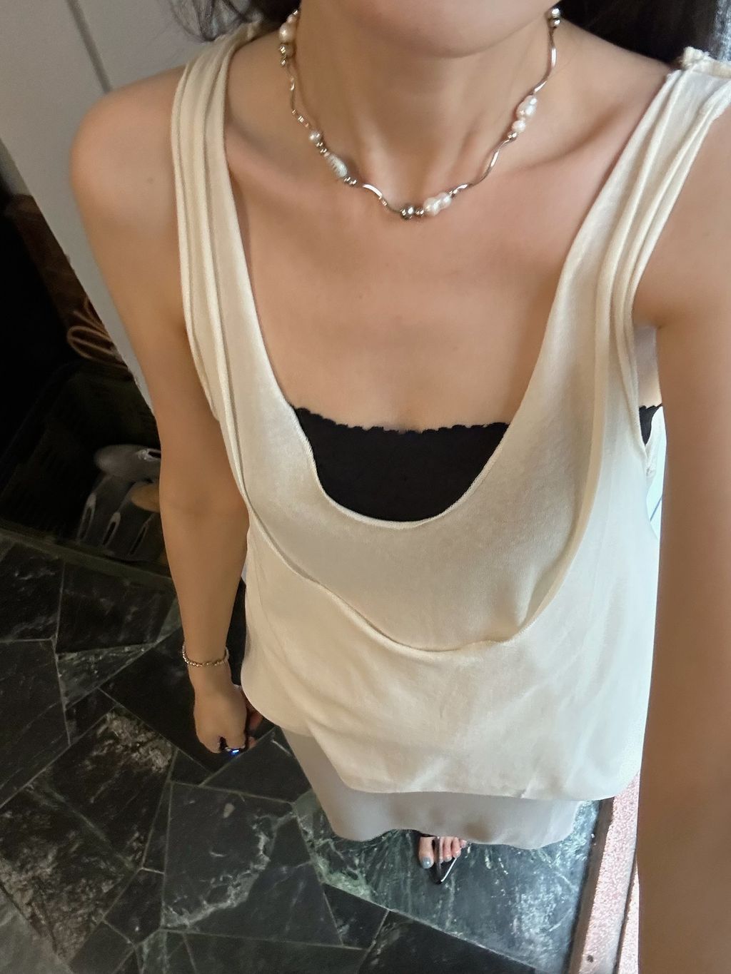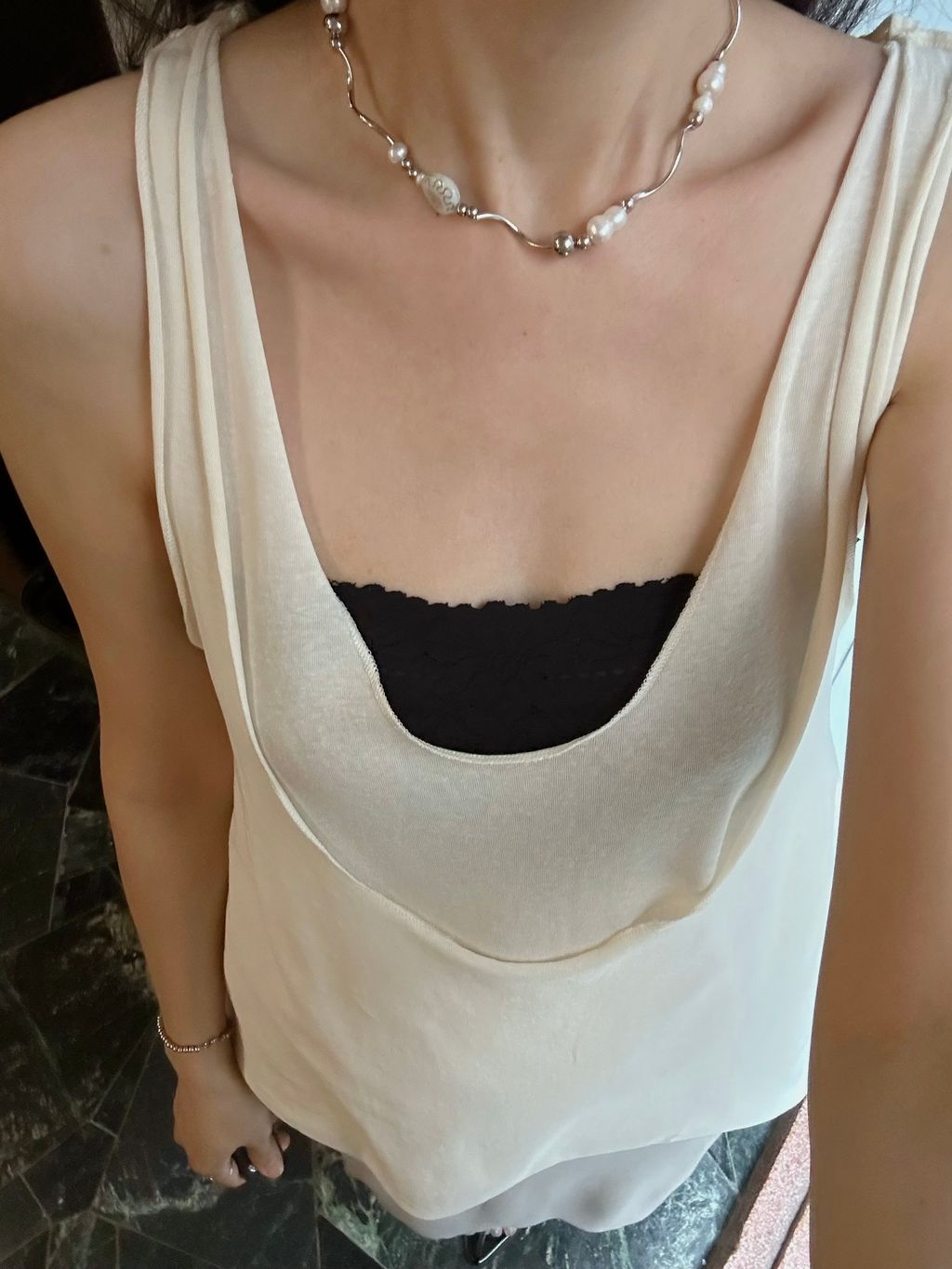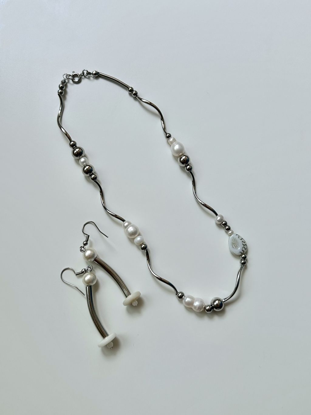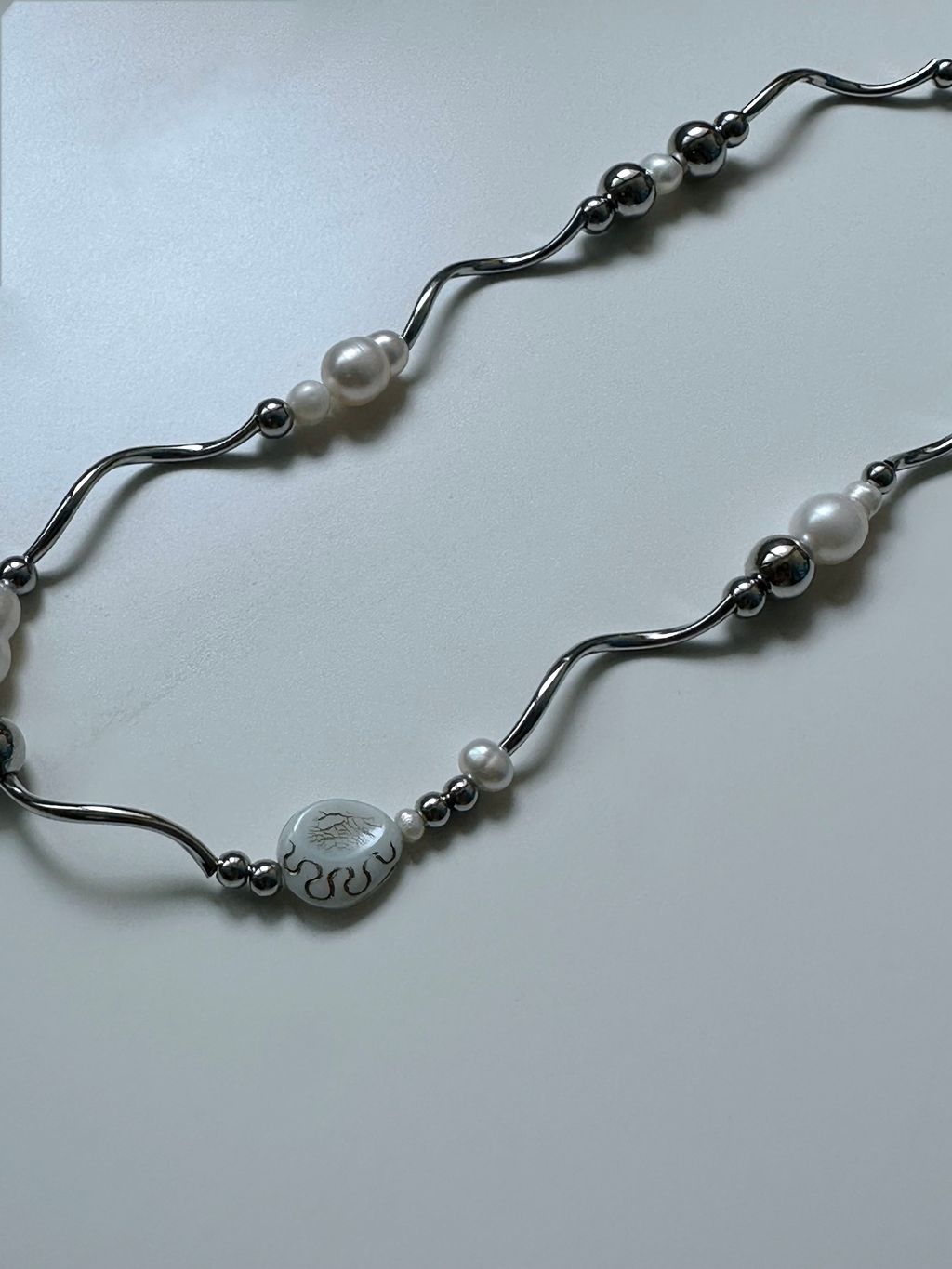 項鍊金屬部分也為鋼材製作,好照顧不變色,還有搭配天然淡水珍珠,有基礎的圓形和飽滿立體的特殊變形珍珠很個性,再點綴手工刻畫的蛋白琉璃石