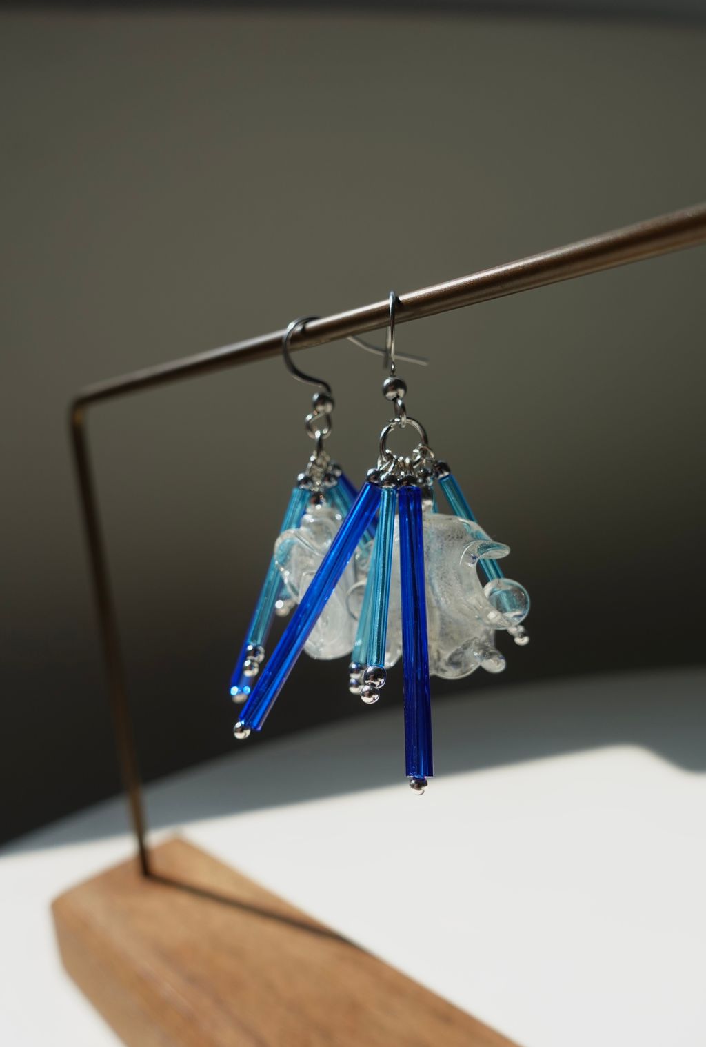 利用玻璃跟琉璃的清透光澤製作出層次的耳環