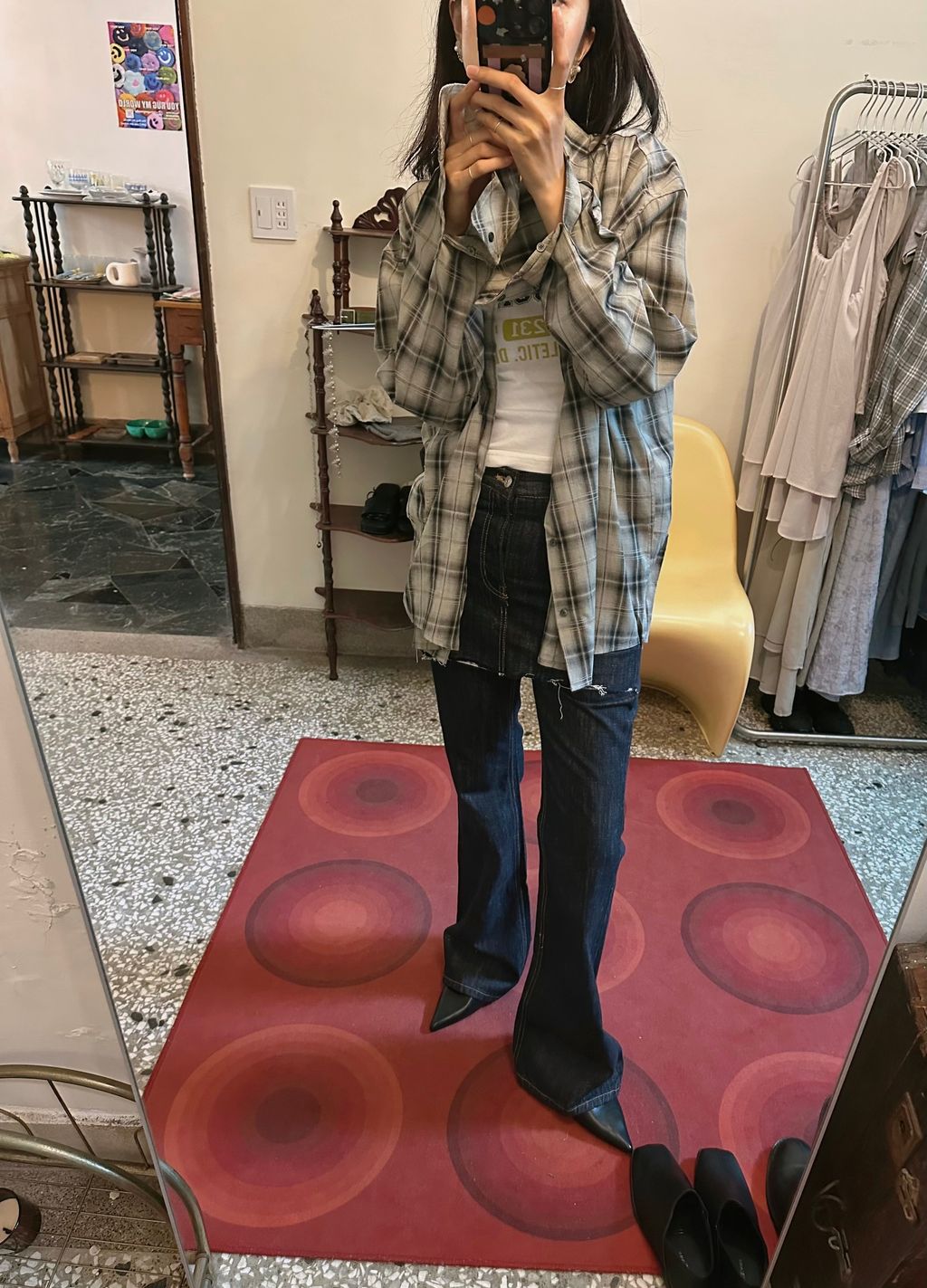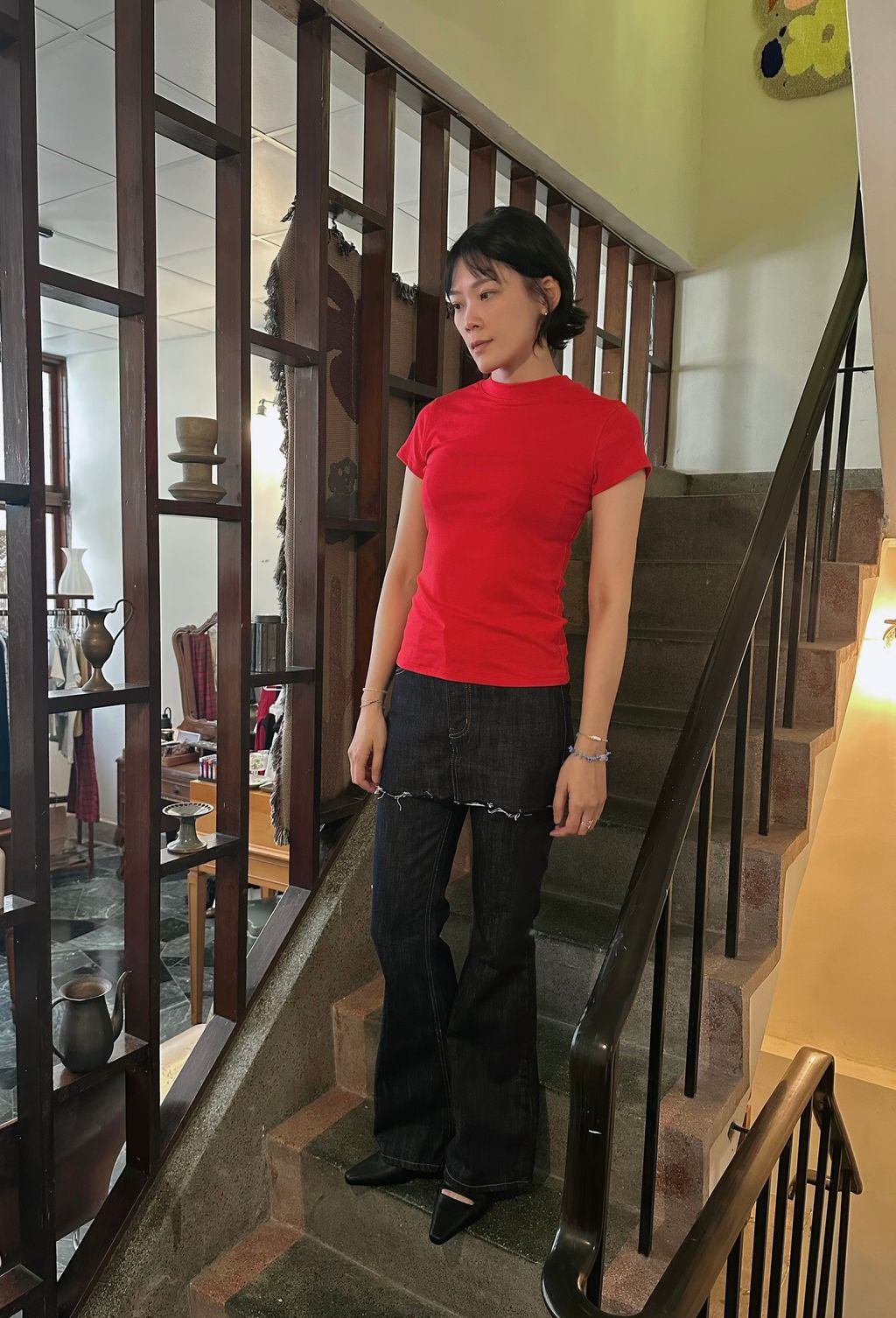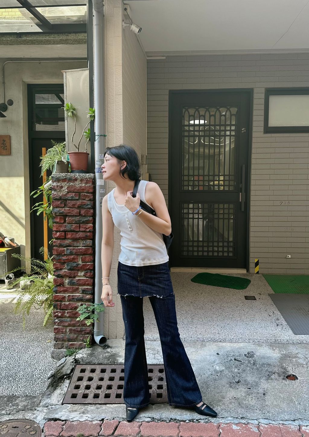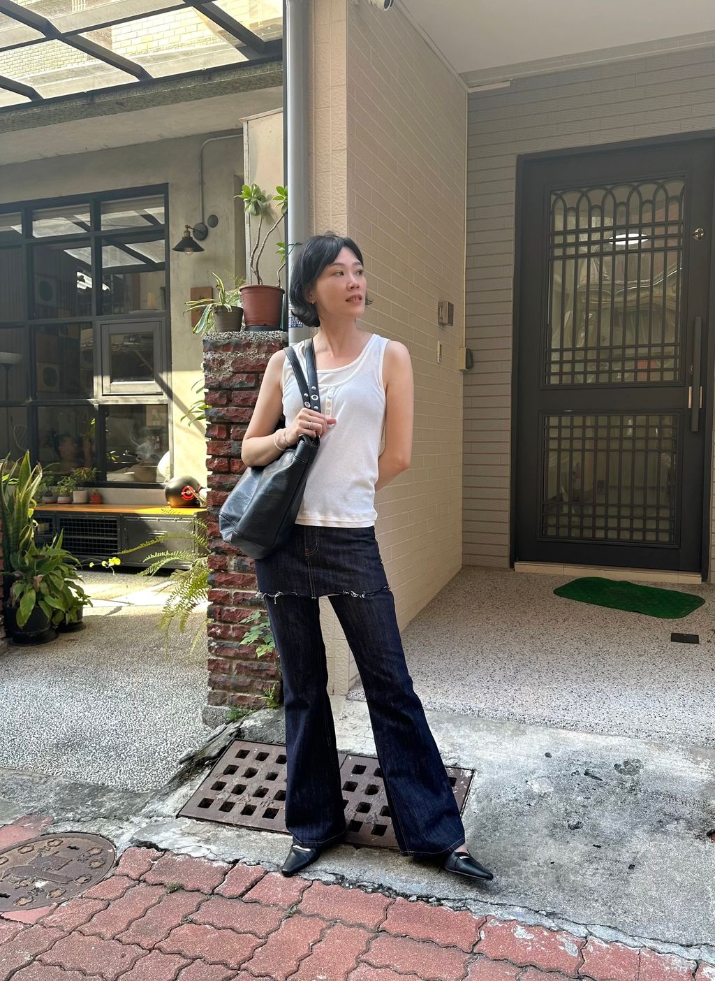 覺得這件許多細節都神來一筆,先說這件超顯腿的比例,會變長長長,因為合身加喇叭褲型加短裙比例