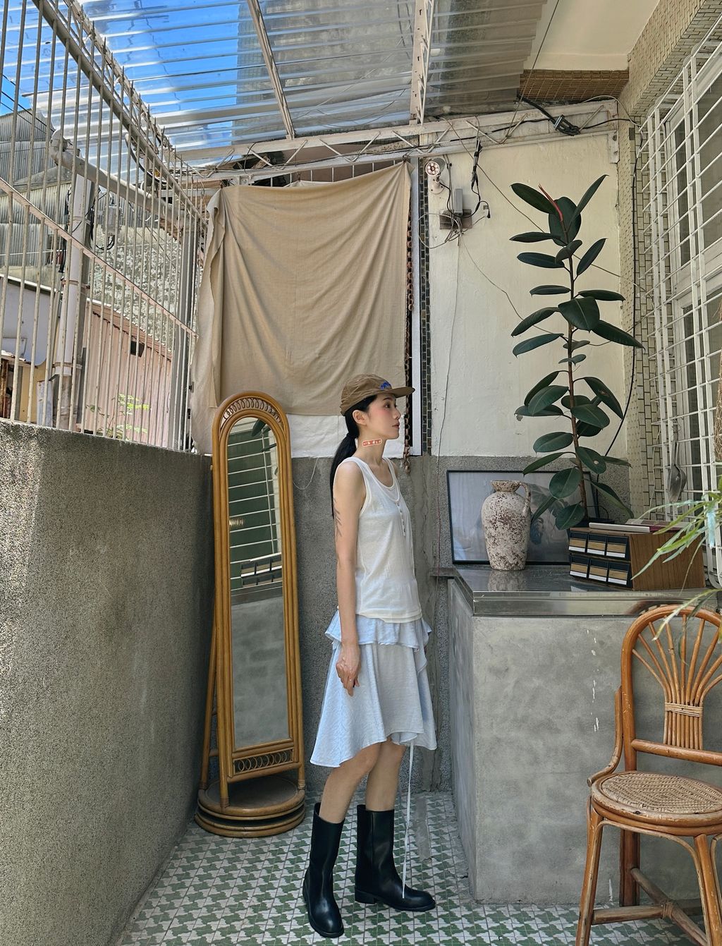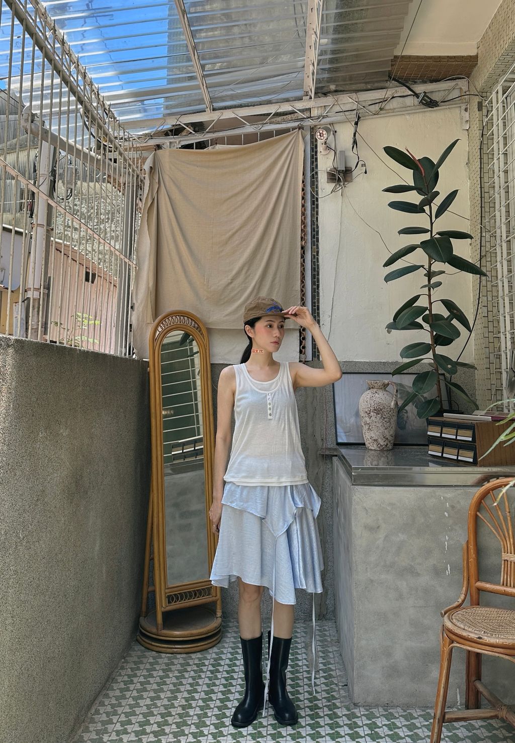 當然要將衣服下襬扎進腰頭裡也會是俐落好看的,尤其布料薄很好調整線條