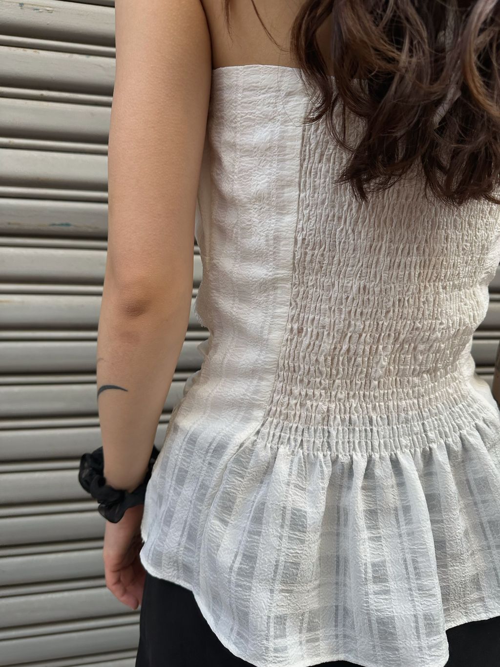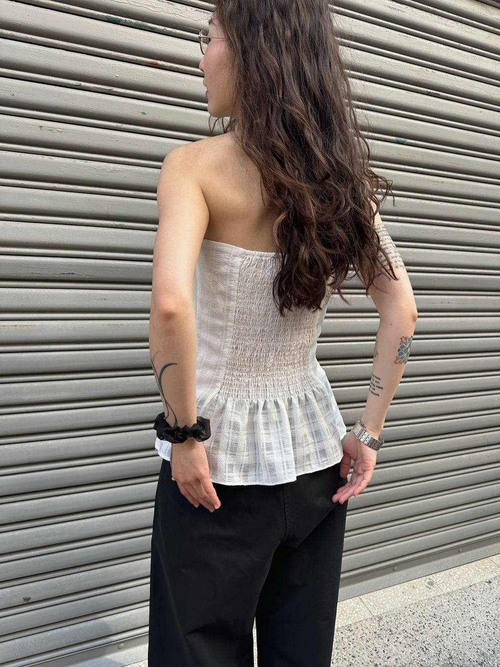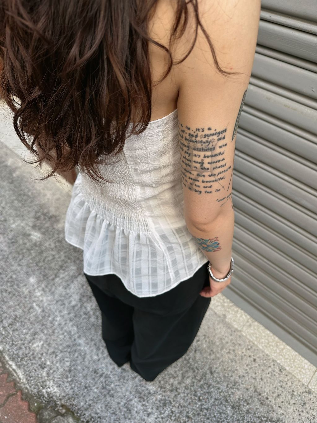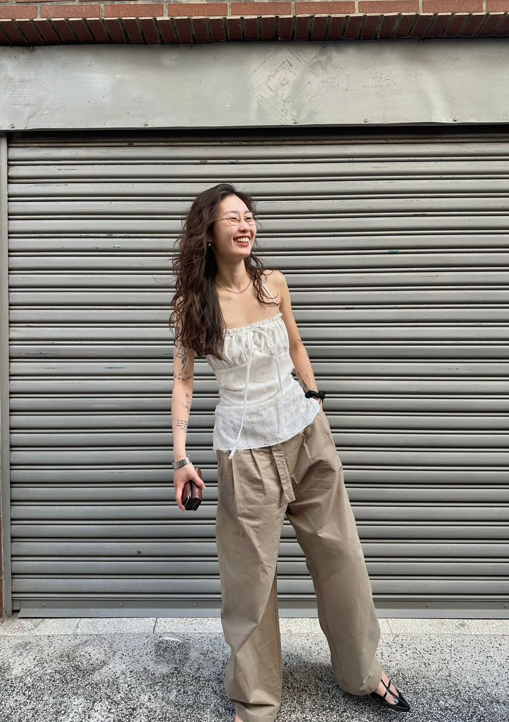 整件的剪裁非常細緻、費工,真的很少見一件肩帶上衣做了這麼多工藝,還搭配不同層次的布料